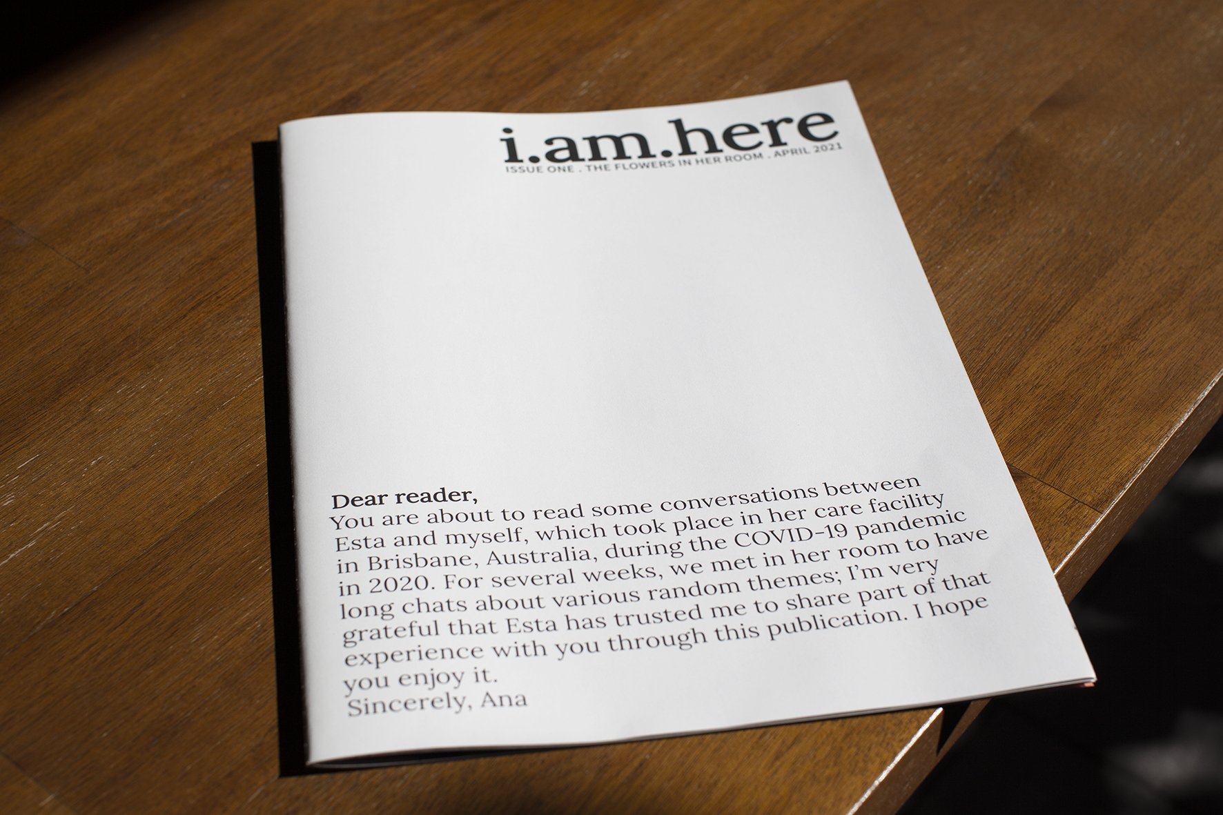I Am Here (V.I & II) is a printed publication featuring aged care residents’ stories. The project emerged from my ten years of experience working on long-form documentary projects focused on documenting stories of older members of my community. I Am Here explores art practice as a means of fostering dialogue and connectedness between aged-care residents, staff, and the rest of the community. Specifically, I worked closely with St. Vincent’s Aged Care in Brisbane, Qld, —a non-profit institution with which I ran an initiative aiming for aged-care residents to feel connected during COVID-19 pandemic. Such project involved setting up video-calls and face-to-face social visits to residents on a weekly basis for a period of two years—as well as recording conversations, transcribing, editing, photographing, designing, and publishing. The first two issues were published in collaboration with Visual Studies Workshop in Rochester, New York, and have been distributed for free in aged care facilities aiming for residents and staff to engage with their own stories.